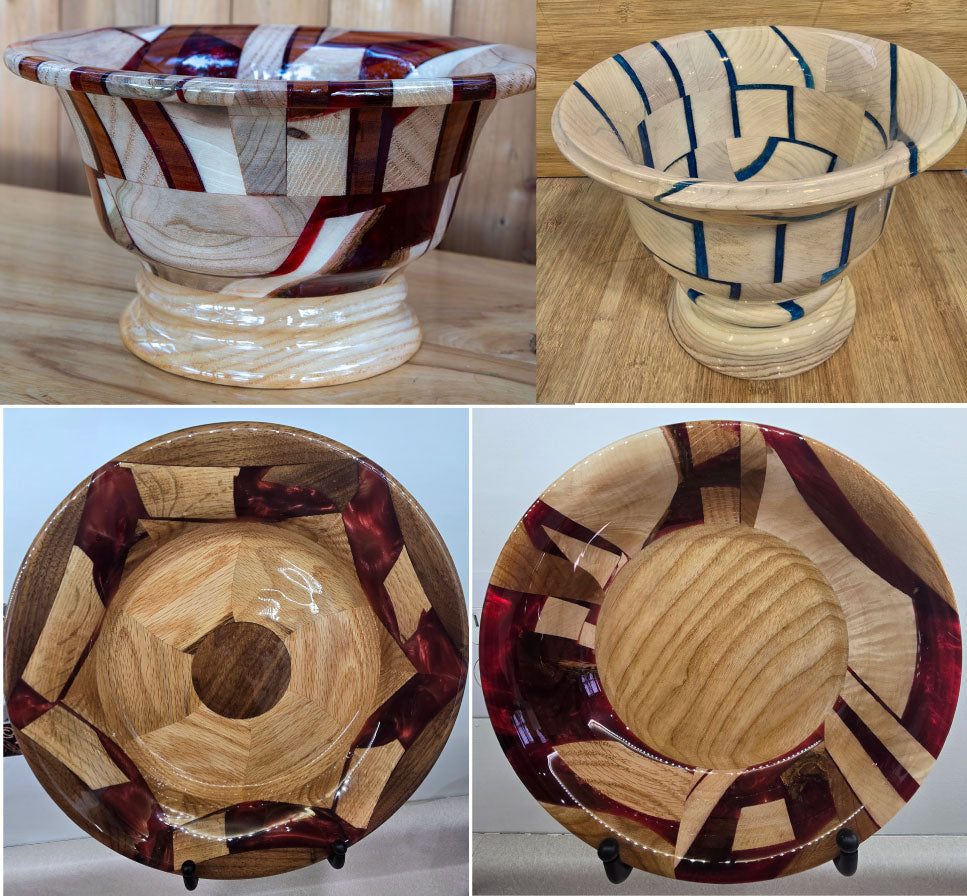 These are pictures of some of our recently turned bowls. These are hybrid bowls made with wood and colored resin and turned in my shop in Northern Minnesota, the "Land of 10,000 Lakes".
